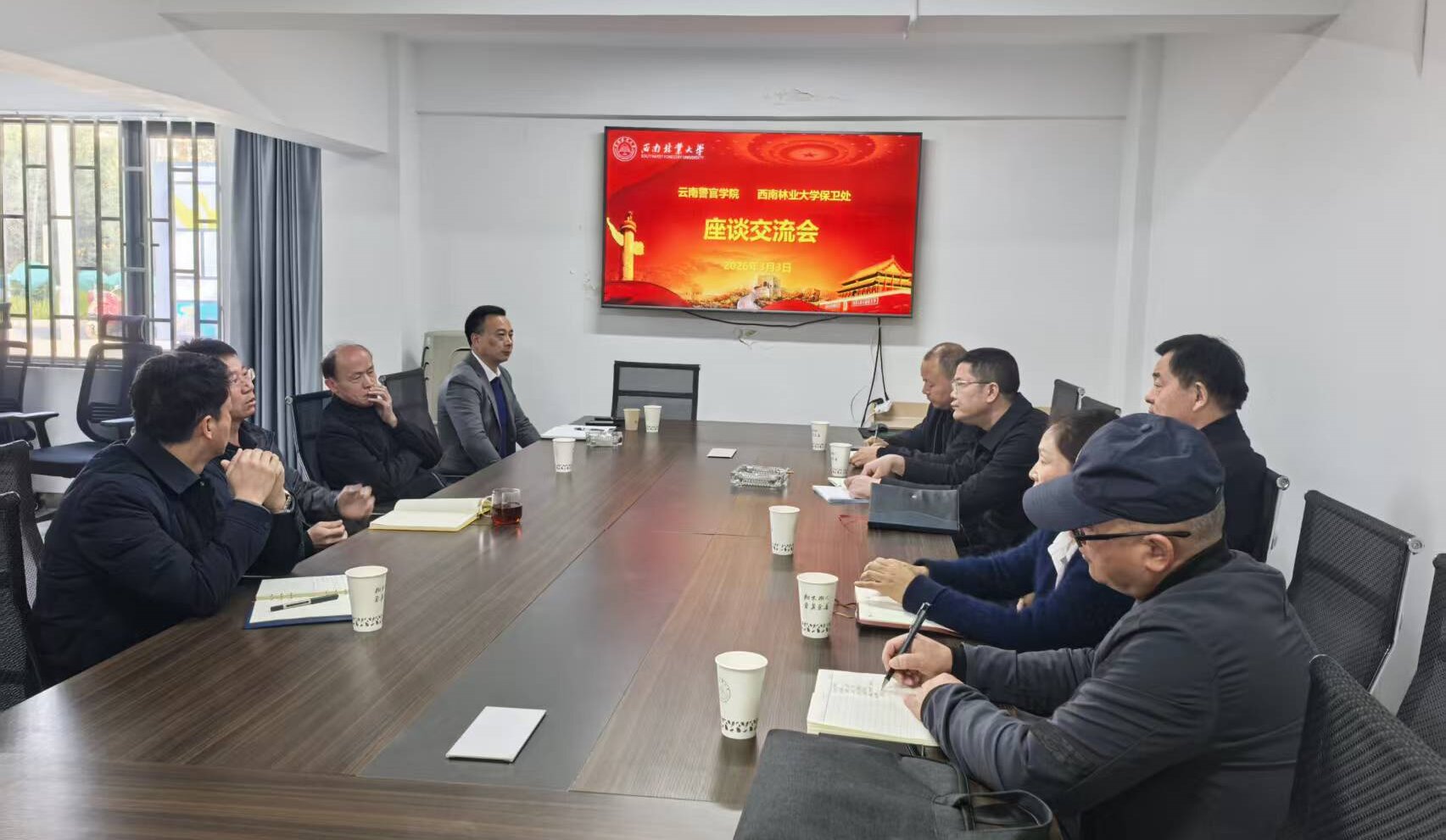 3月3日,云南警官学院一行到我校座谈交流。座谈会上,保卫处、资产经营有限公司相关负责人介绍了我校校园交通安全管理工作的实施举措与阶段性成效、消防一体化建设及安防系统建设、学校后勤服务管理等情况。会后,云南警官学院一行参观了我校交通测速系统、道闸管理系统、安防监控中心及消防控制中心的运行管理情况,并对校园食堂运营状况进行了考察。此次交流座谈旨在加强两校部门之间的沟通与协作,相互学习、借鉴彼此经验,共同探讨校园安全管理的新思路与新方法,...