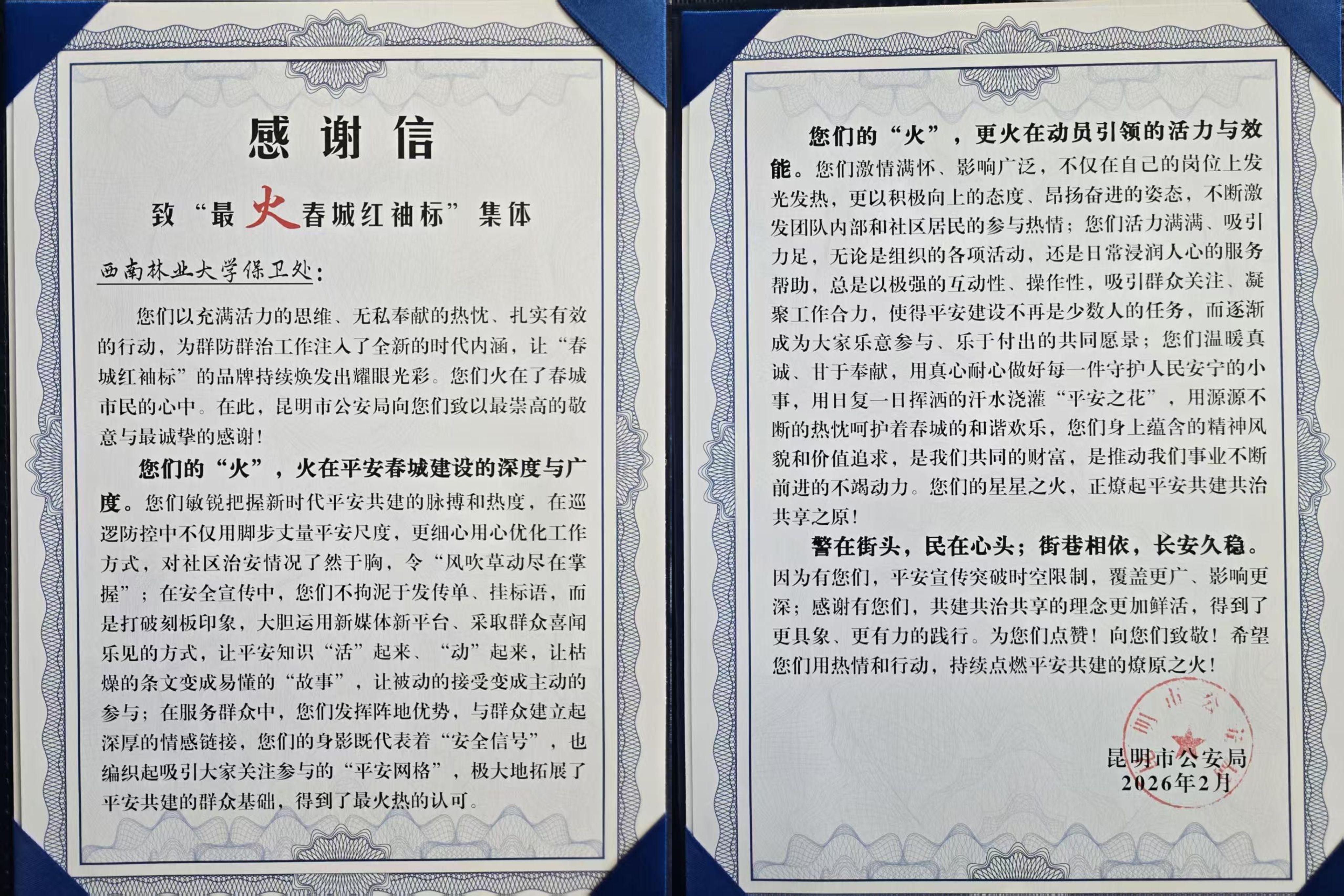近日,昆明市公安局向我校发来感谢信,对我校在春城“红袖标”治安志愿服务活动中的突出表现给予高度肯定与诚挚感谢,并将我校保卫处评选为“最火春城红袖标”集体。活动中,我校保卫处积极响应号召,聚焦交通秩序构建,抓实抓细工作开展,学校及周边交通事故明显减少,校内交通秩序明显改善,师生交通安全意识明显增强。此次获评“最火春城红袖标”集体,是对我校平安建设工作的肯定,也为平安西林、平安社区建设凝聚了更强合力。(...